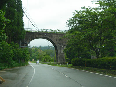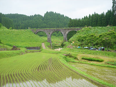 集落の入り口で、廃線になった宮原線のアーチ橋を発見。新緑に映えて見事です。