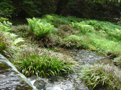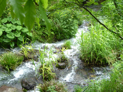 水源は森の中にあって、苔むす中に見事な清水が湧き出しています。
