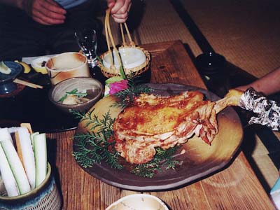 地のものを使った会席だけでも結構なボリュームですが、さらに地鶏の丸焼きや鍋まで登場。